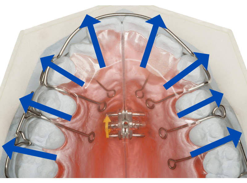 先ほどご説明した通り、小顔で顎が小さい方はスペースが足りません。そこでスペースを確保するために、前歯しか動かせない格安矯正でよく用いられるのが、拡大床という治療法です。